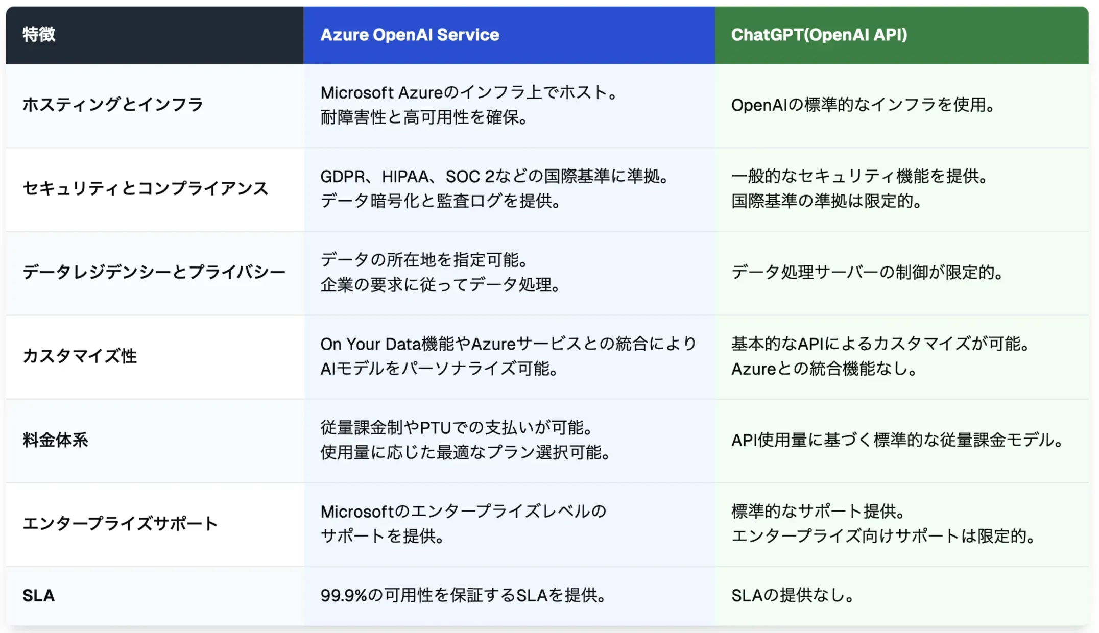 小規模な実験や個人プロジェクトでは OpenAI API の方が適している場合もありますが、Azure OpenAI Service は Azure のセキュリティや他サービスとの連携、Microsoft 社のサポートも利用できるため、企業の本格的な AI 導入に適しています。