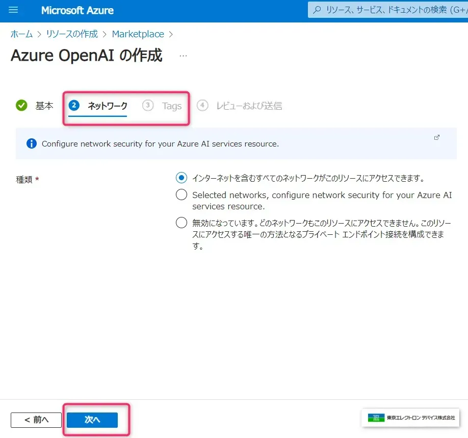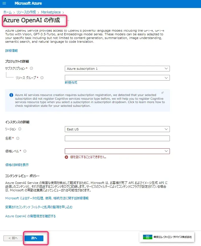 - 「Azure OpenAI の作成」の基本画面が表示されるので、必要事項を入力し、[次へ] を選択します。