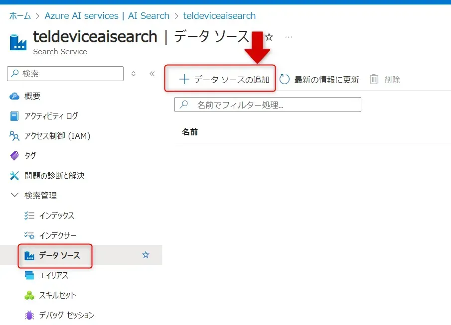 - Azure AI Search サービスのリソースページの、サービスの左メニューから「データソース」を選択し、ページ上部にある「+データソースの追加」ボタンをクリックします。
