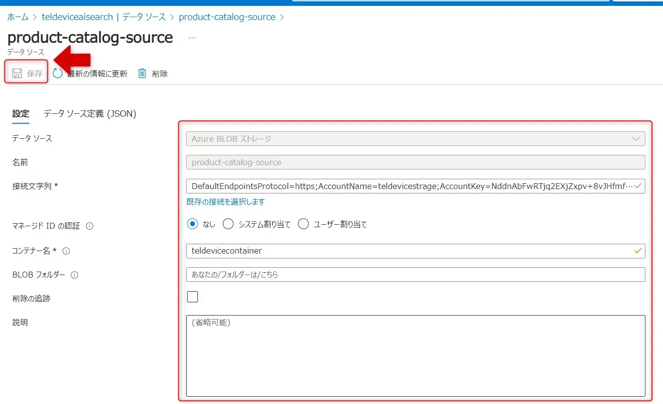 - 接続文字列:Azure Blob Storage への接続文字列を入力します。これは Azure Storage アカウントの「アクセスキー」メニューから取得できます。