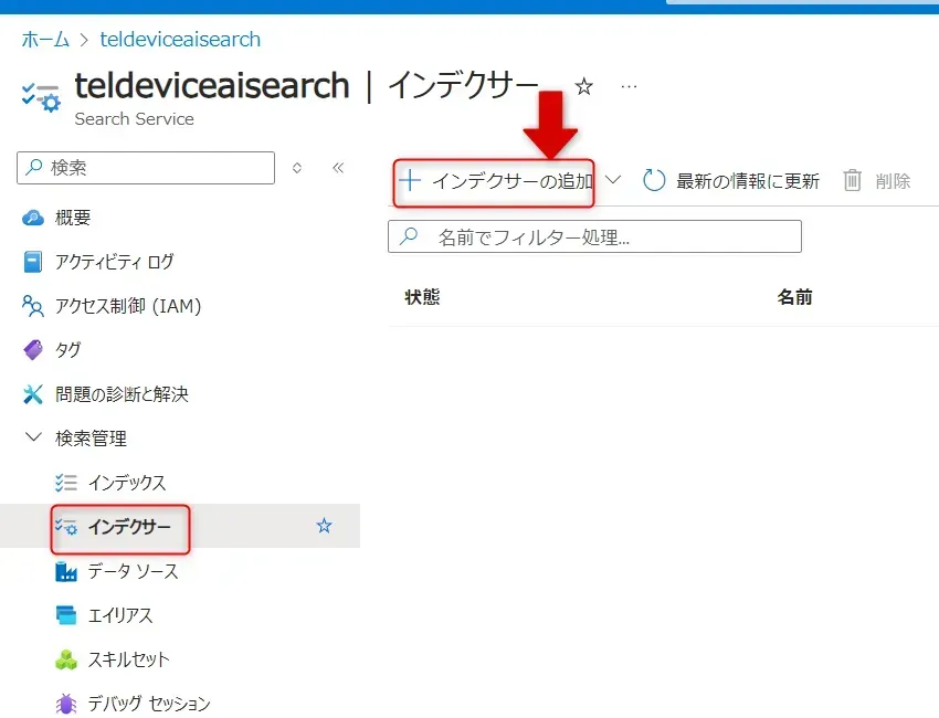 - Azure AI Search の左メニューに「インデクサー」という項目を選択し、「+ インデクサーの追加」を選択します。