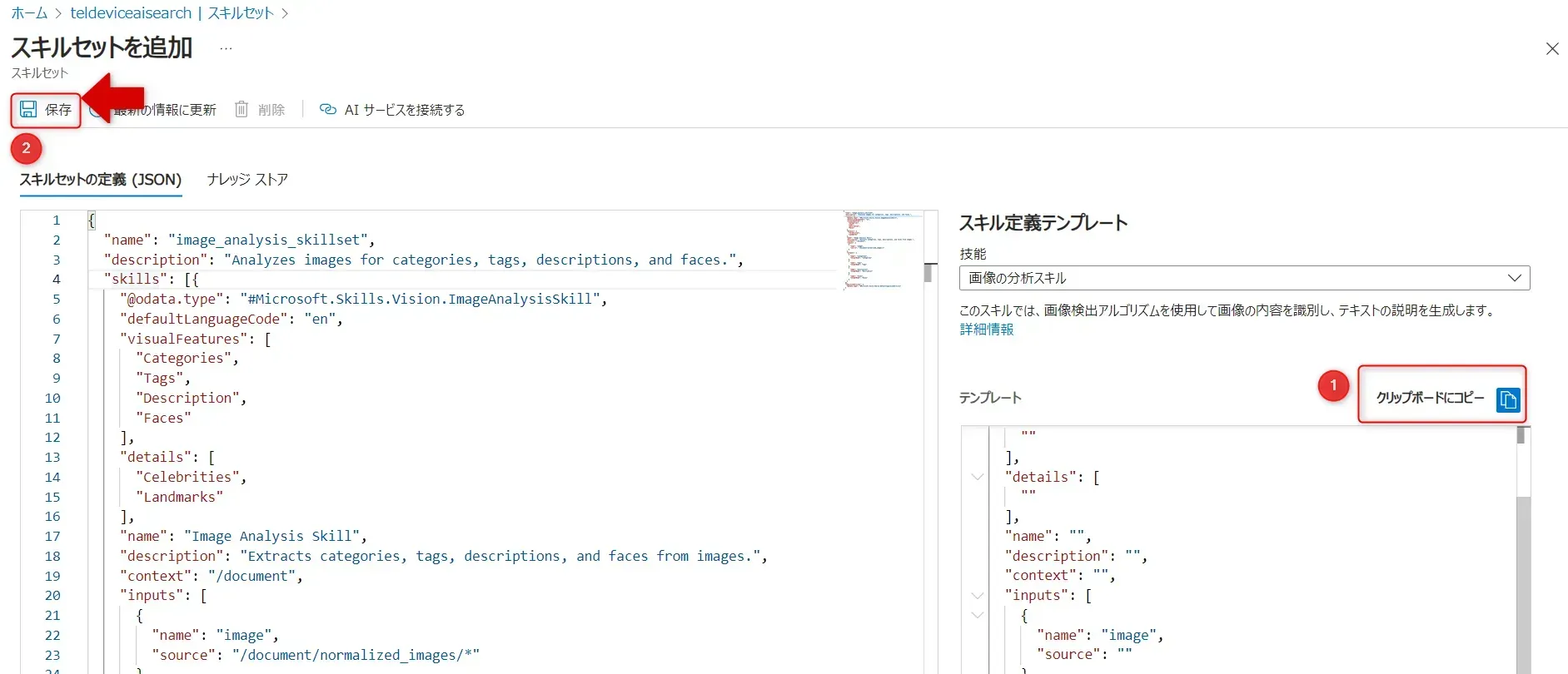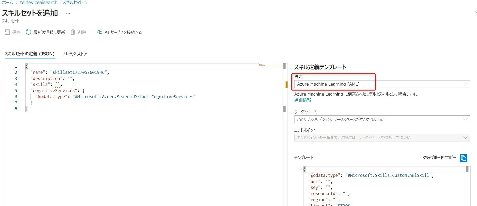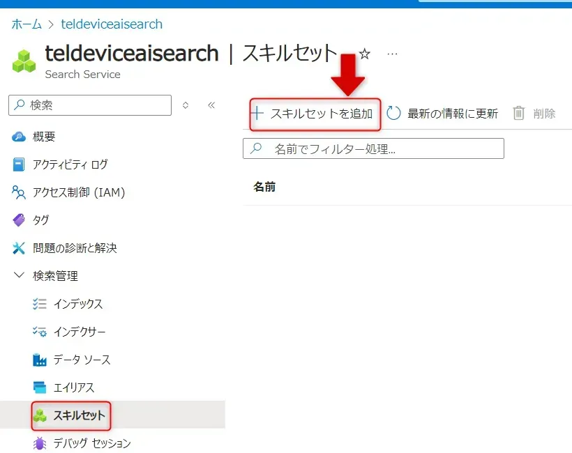 - Azure AI Search の「スキルセット」メニューから「+スキルセットの追加」を選択します。