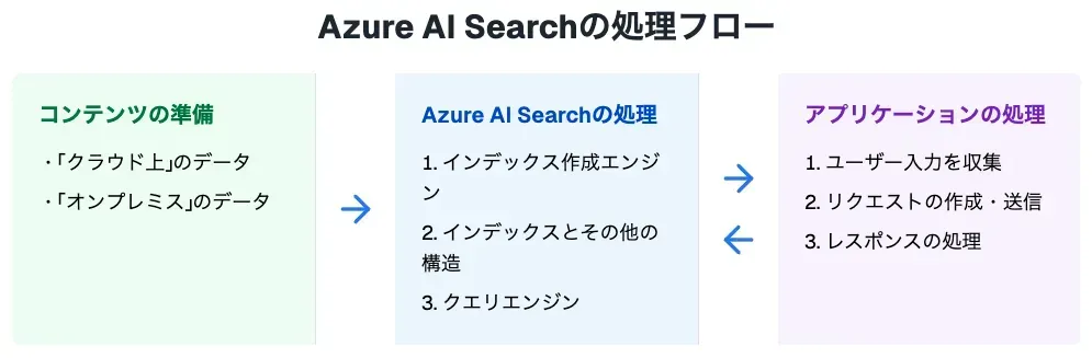 以下の図は、Azure AI Search を使用したデータ処理の流れを 3 つの主要なステップで示しています。