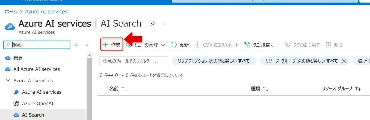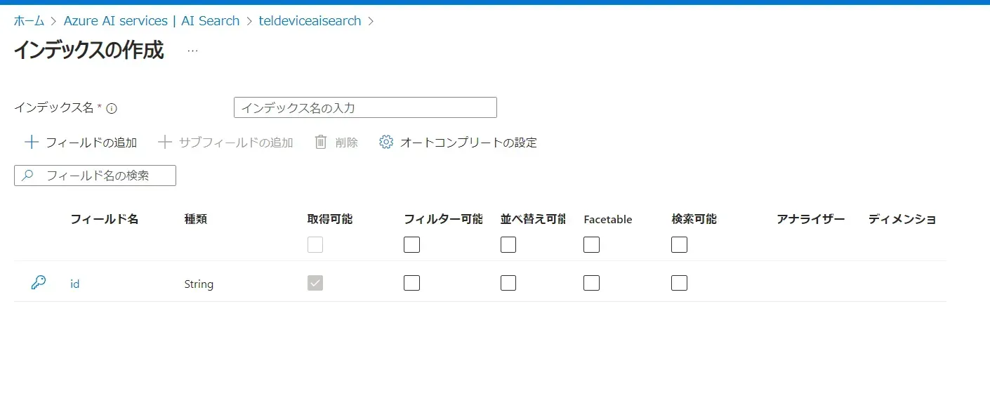 - Azure ポータルで先ほど作成した Azure AI Search サービスの「+インデックスの作成」を選択します。