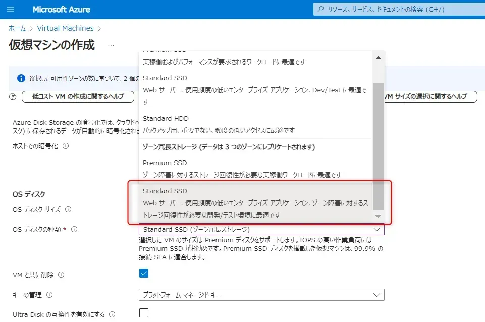 上記、OS ディスクとデータディスクでは、ディスクの種類を以下の 5 種類から選ぶことができます。