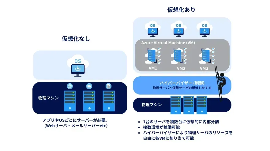 ※「オンプレミス環境」とは、自社でサーバーを所有・運用する環境全般を指します。仮想化を導入している場合もありますが、クラウド仮想化サービスは、オンプレミス仮想化と比較して一般的に高い柔軟性、可用性、効率性を提供します。