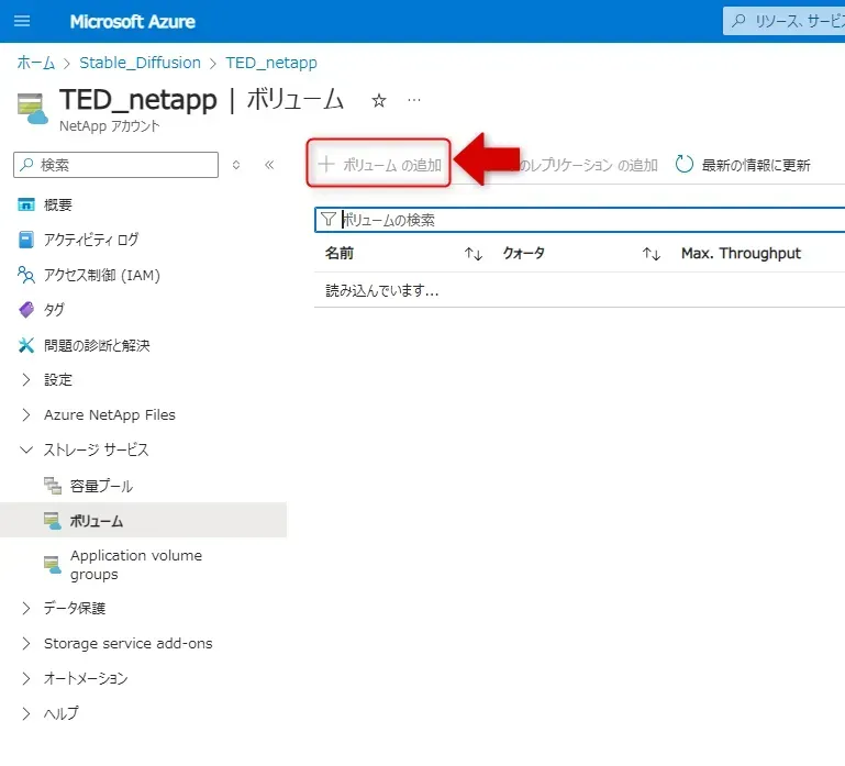 - 容量プール作成後、「ボリューム」→「ボリュームの追加」をクリックし、新しいボリュームを作成します。