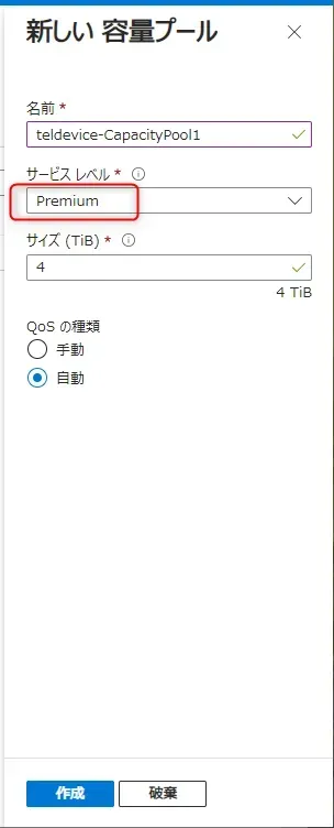 パフォーマンスレベルの選択と変更は容量プールを作成する際、または作成した容量プールに行うことができます。