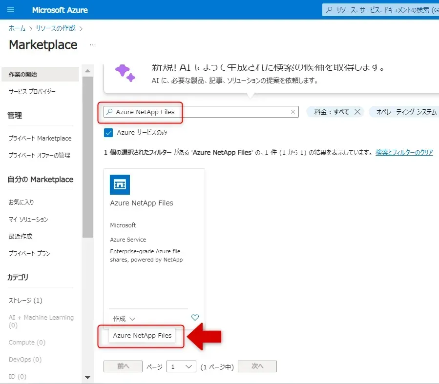 - Azure ポータル画面の「リソースの作成」で「NetApp Files」で検索し、「Azure NetApp Files」をクリックします。