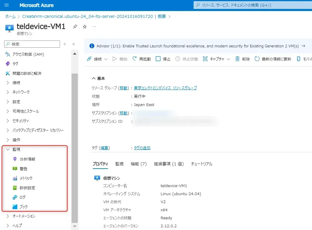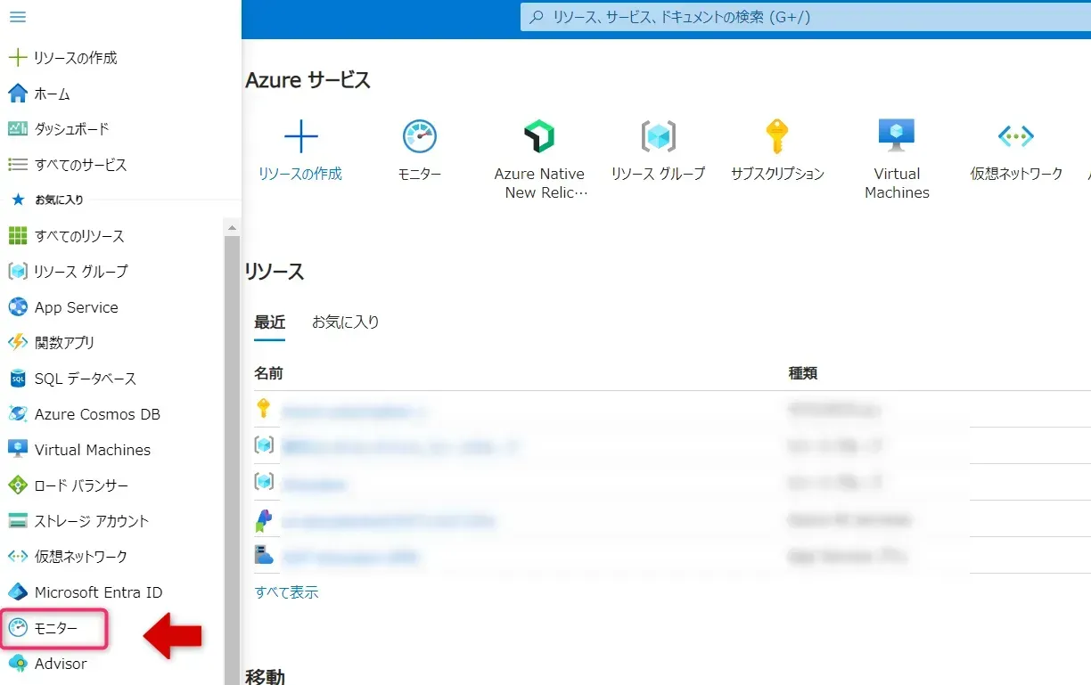 また、リソースグループや各 Azure リソースの設定ページからも、そのリソースグループやリソース固有の監視設定を行うことができます。手順は次のとおりです。