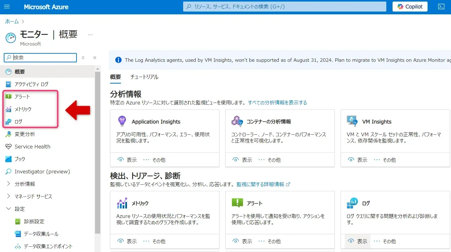 左側のメニューから「メトリック」「ログ」「アラート」などの項目を選択することで、どのタイプのデータを監視・分析するかを決めます。