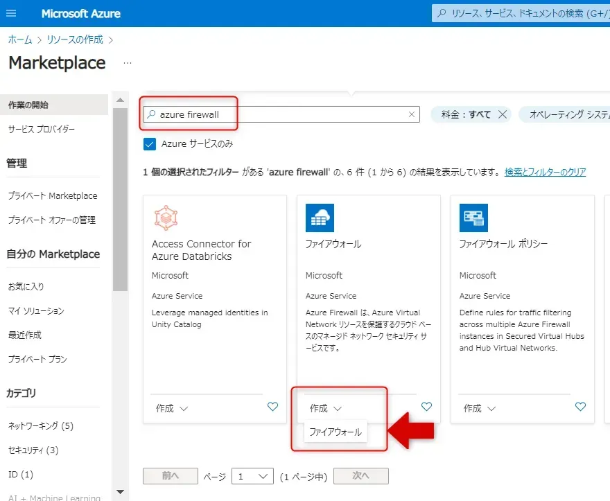 - Azure ポータル画面の「リソースの作成」で「azure firewall」で検索し、「作成」→「ファイアウォール」をクリックします。