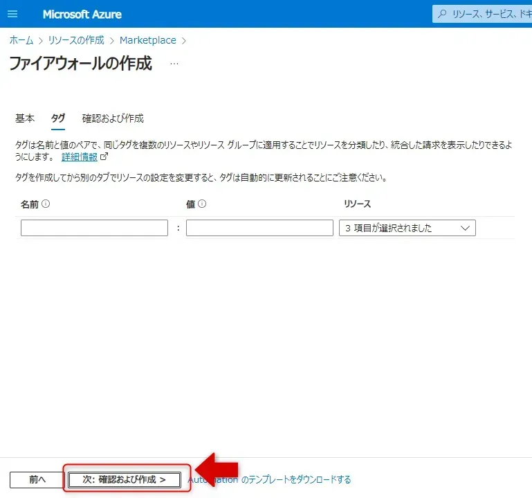 - 「タグ」タブで「次: 確認および作成 >」をクリックします。