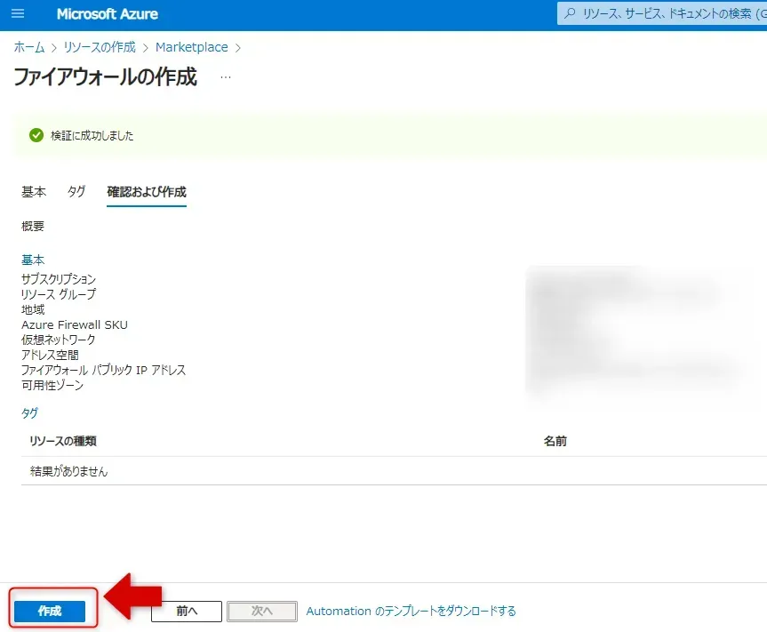 - 「確認および作成」タブで設定に問題ないことを確認します。