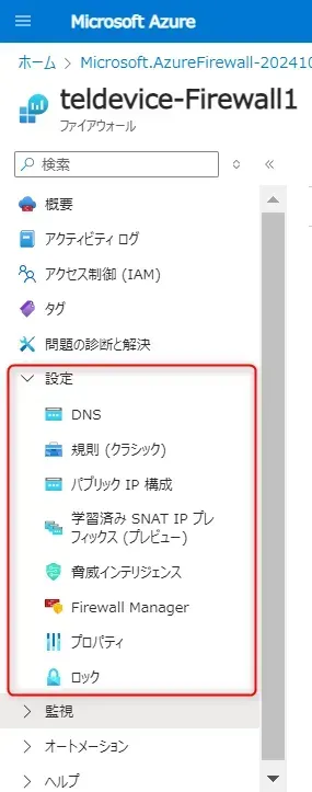 Azure Firewall の設定は以下から確認・変更できます。