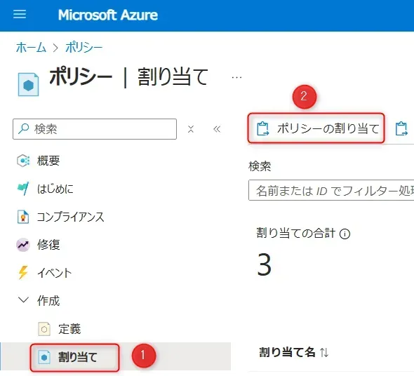 - 左メニューから ①「割り当て」をクリックし、②「ポリシーの割り当て」をクリックすると、ポリシーの割り当ての設定も行うことができます。