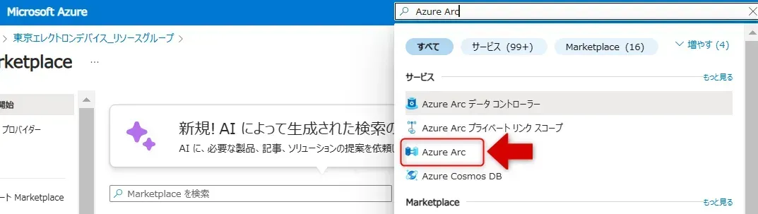 - Azure ポータル画面の検索タブに"Azure Arc"と入力し、表示されたサービスの中から「Azure Arc」を選択します。
