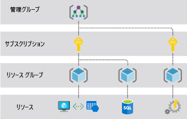 Azureを利用する際には、「管理グループ」「サブスクリプション」「リソースグループ」「リソース」の4つの管理レイヤについて理解しておかなければなりません。
