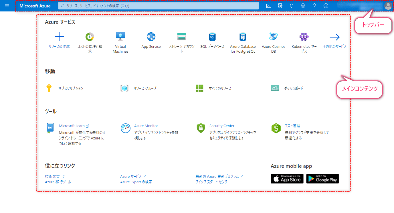 メインコンテンツはAzureサービスやサブスクリプション・リソースグループなどが表示され、仮想マシンなどのリソースを作成済みであれば「最近のリソース」として表示されます。