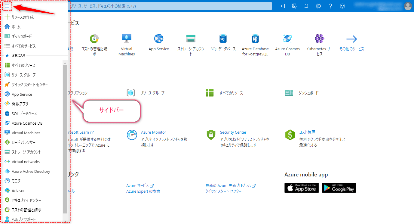 Azure Portalはトップバー、メインコンテンツ、サイドバーの3つの要素から構成されています。