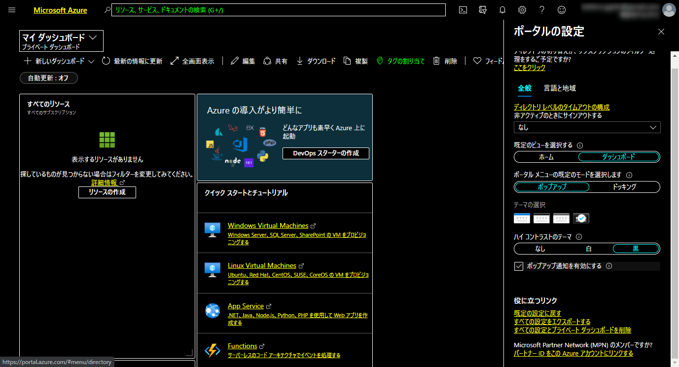 Azure Portalログイン後の画面はデフォルトではホーム画面となっていますが、ダッシュボードを作成していれば設定から変更可能です。その他にテーマの選択なども行えるため、自身が使いやすいようにカスタマイズできます。