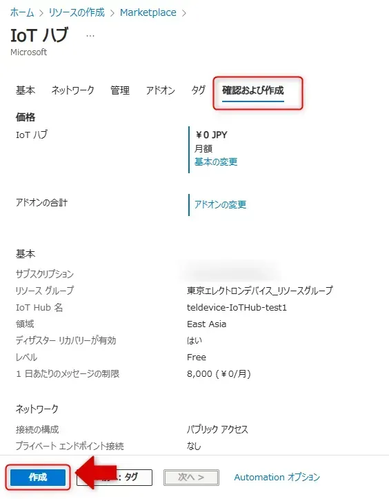 6.「確認および作成」タブで適切な設定がされていることを確認します。 「作成」をクリックします。