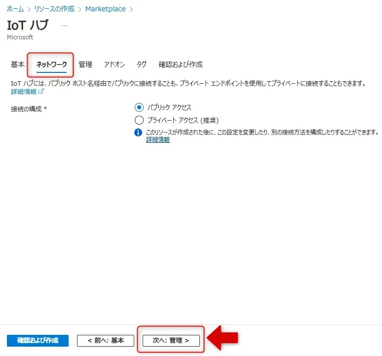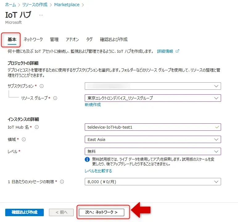 2. 「IoT ハブ」画面、「基本」タブで適切な設定をします。 「次へ : ネットワーク > 」をクリックします。
