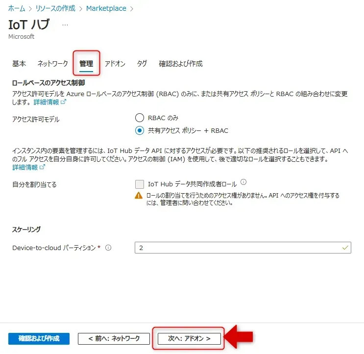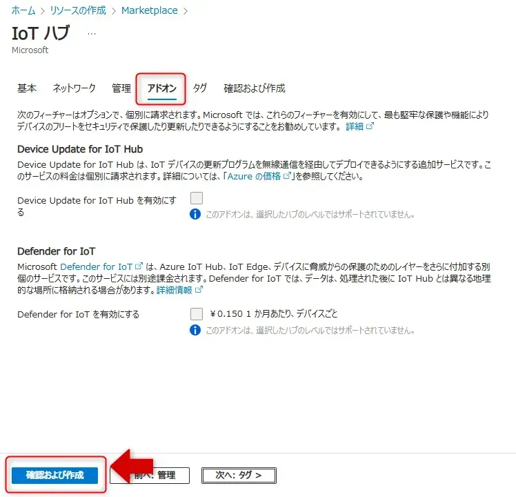 5. 「アドオン」タブで適切な設定をします。 「確認および作成」をクリックします。