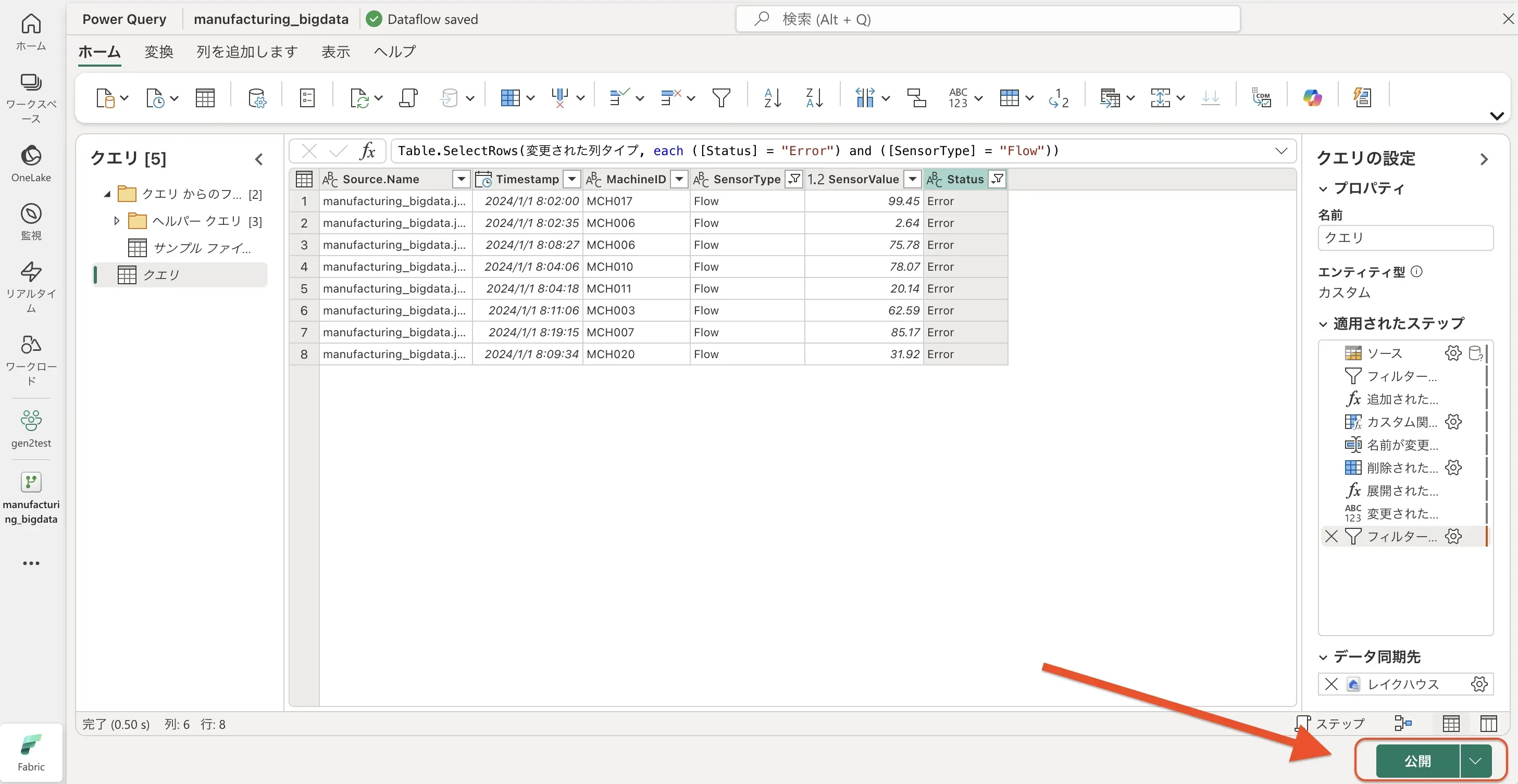 - Dataflow の実行が成功すると、指定した出力先(今回はレイクハウスのテーブル)に、変換後のデータが格納されます。