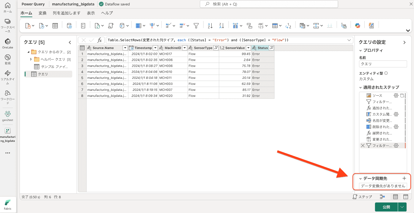 - 実行に失敗した場合は、更新履歴に表示されるエラーメッセージを参考に、Dataflow の設定 (接続情報、変換処理など) を修正し、再度「公開」してください。