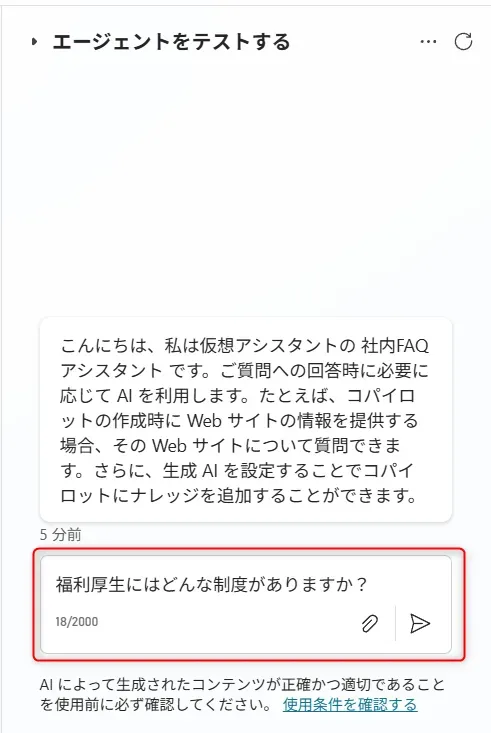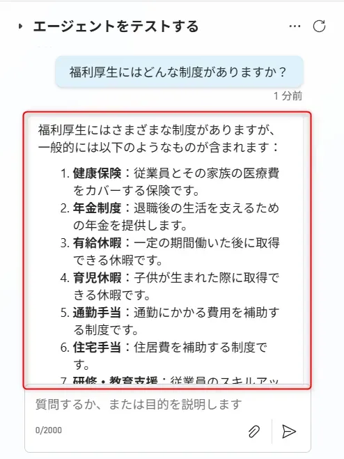 1.右側のテスト用チャット画面で実際に質問してみます。