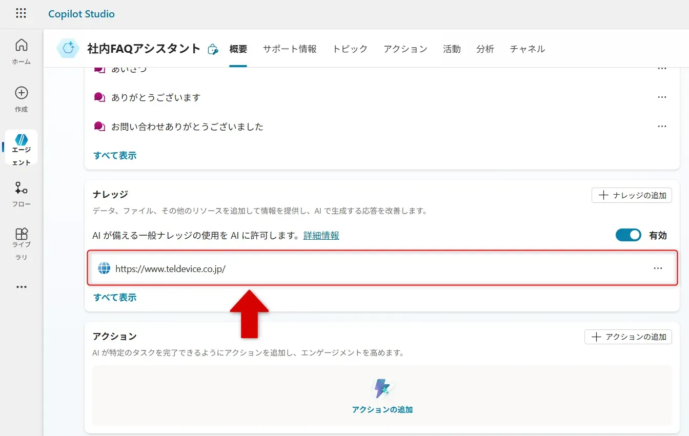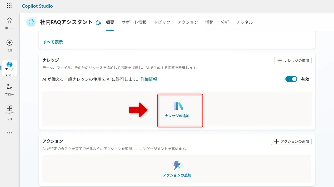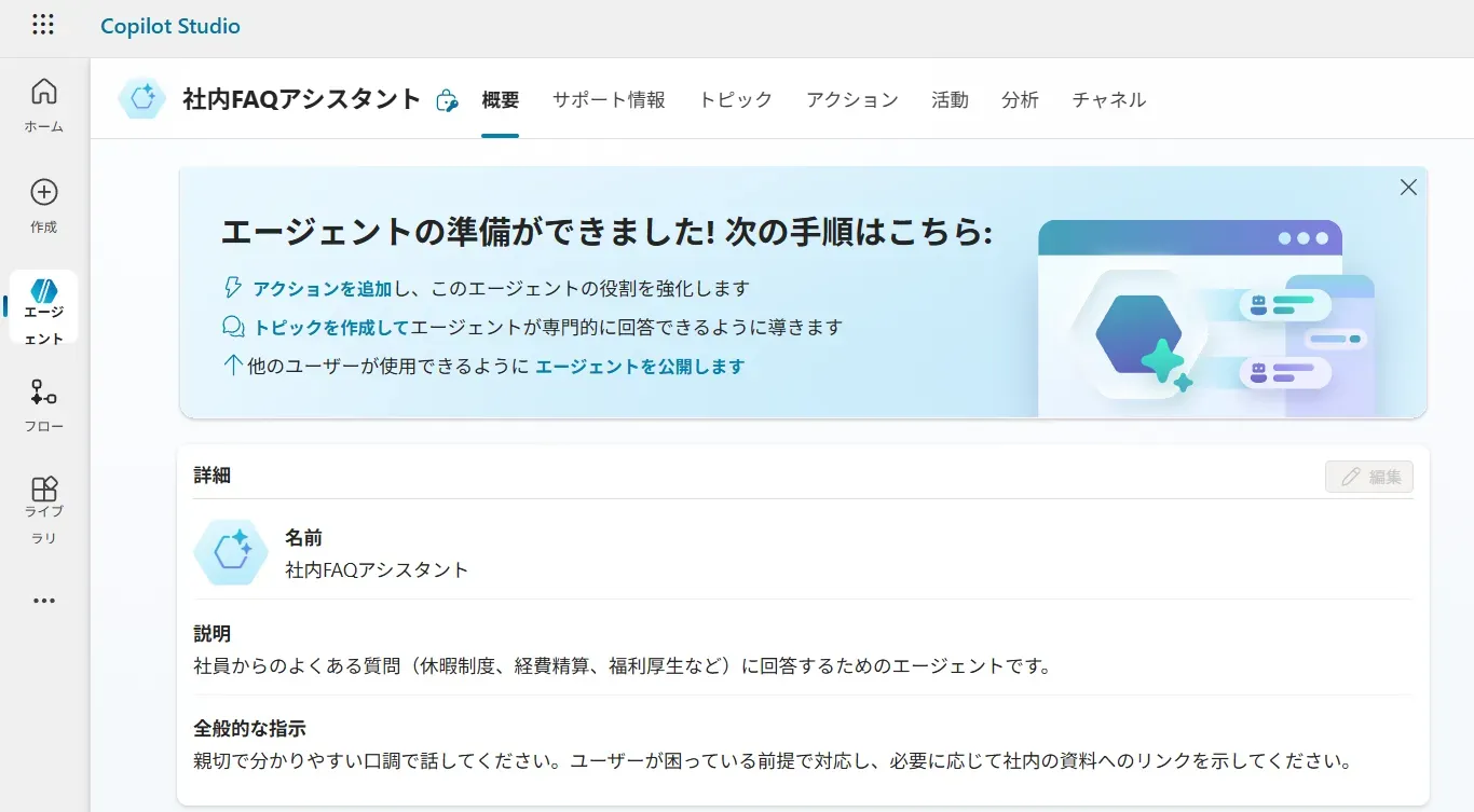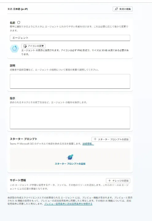 - ナレッジ(知識ソース)がまだ追加されていない状態では、エージェントは一般的な知識や指示文だけをもとに応答を生成します。 この段階で、以下の2点を必ずチェックしましょう。