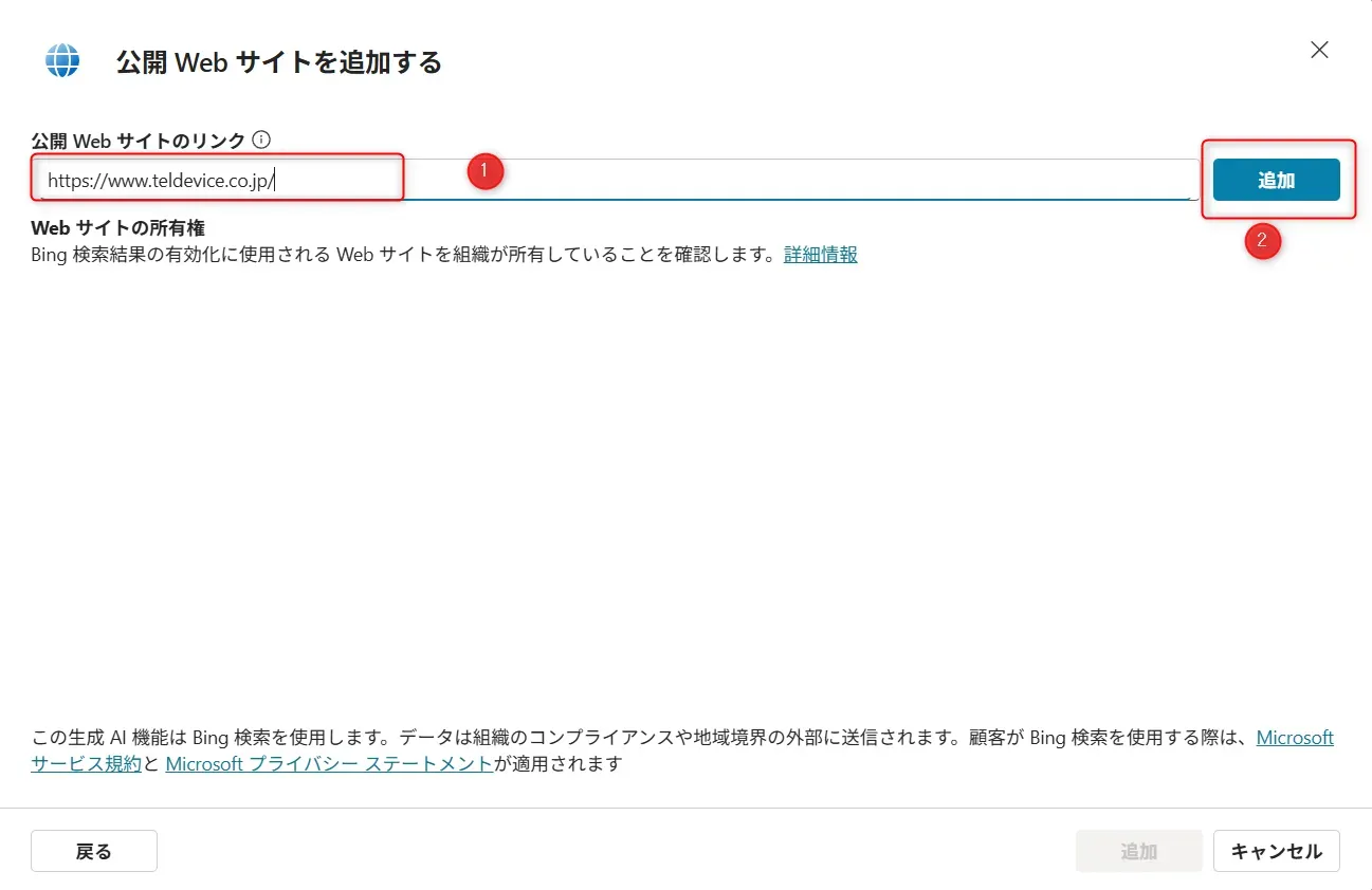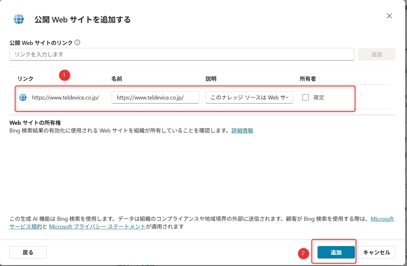 - ①公開webサイトのurlを入力し、②「追加」をクリックします。