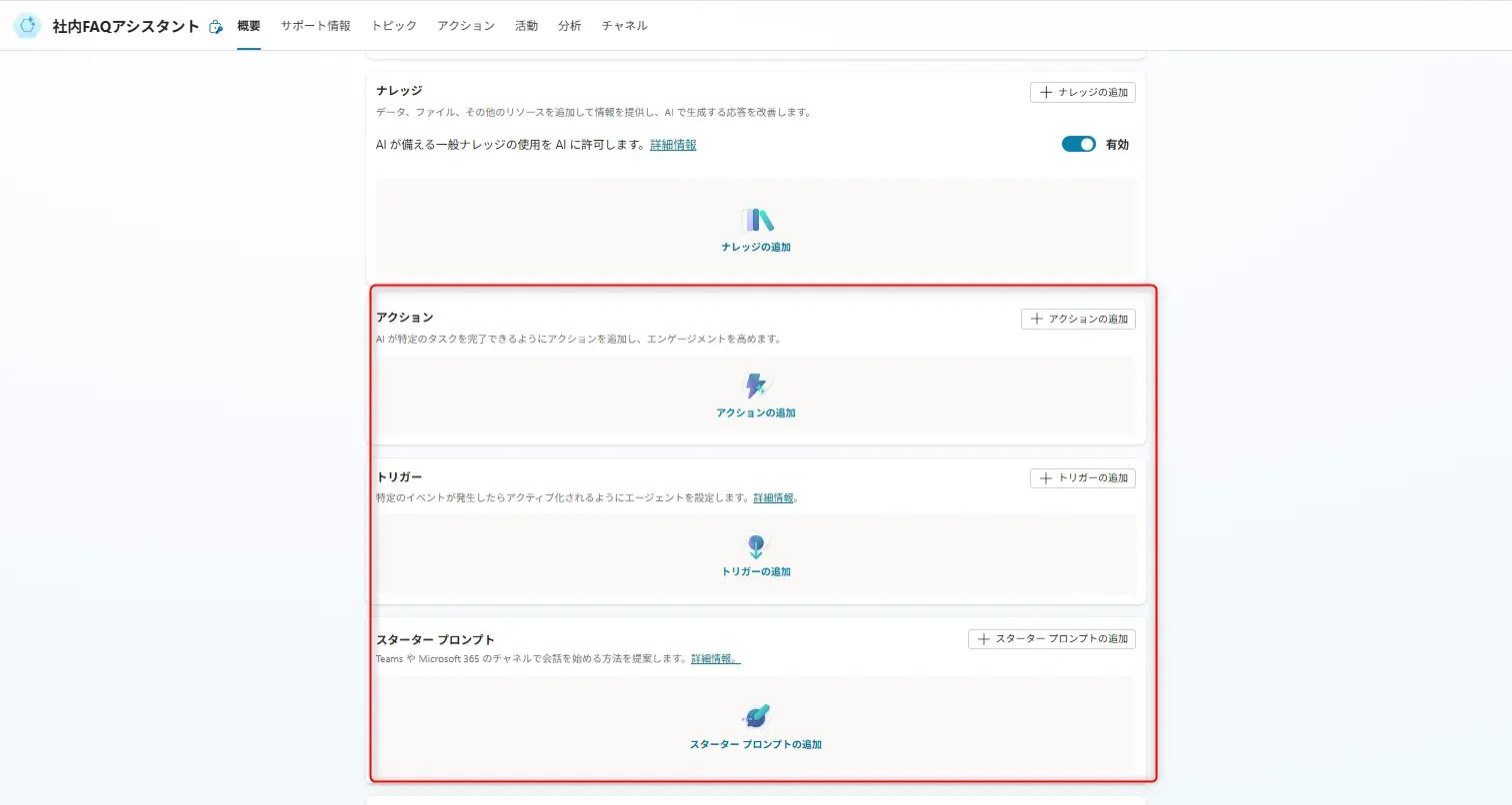以下のように、「アクションの追加」「トリガーの追加」「スタータープロンプトの追加」などの設定も行うことができます。