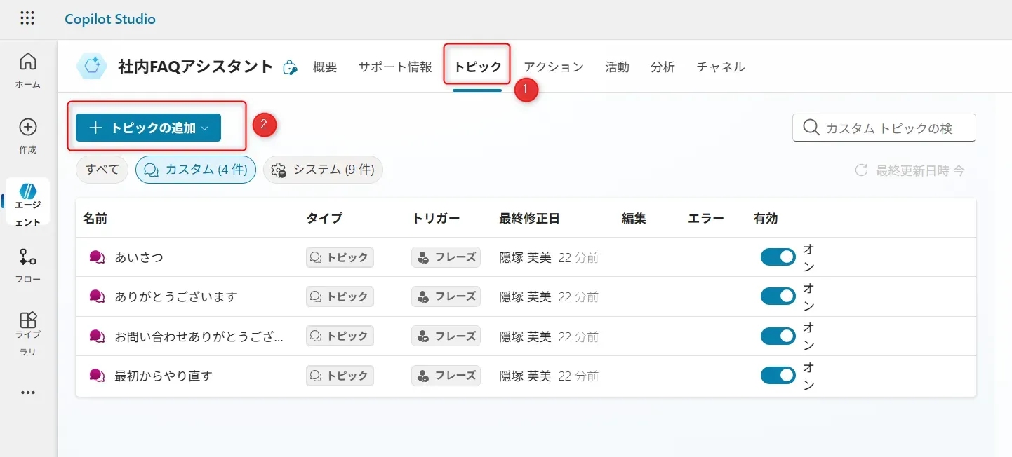 また①「トピック」→②トピックの作成から、特定の話題やタスクに関する対話の流れを定義することも可能です。