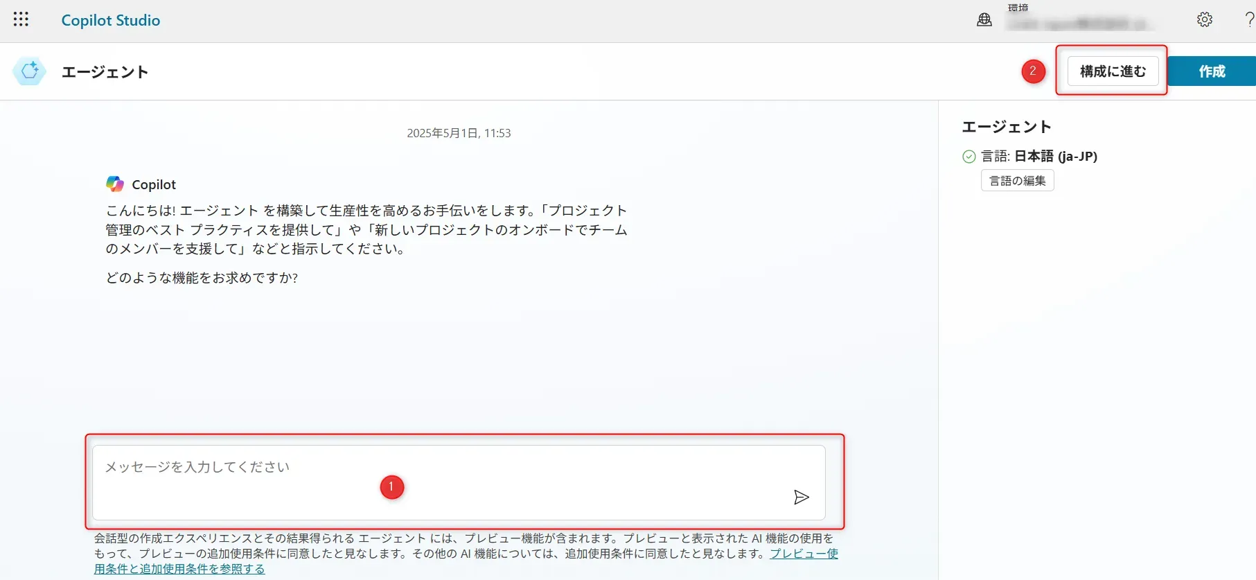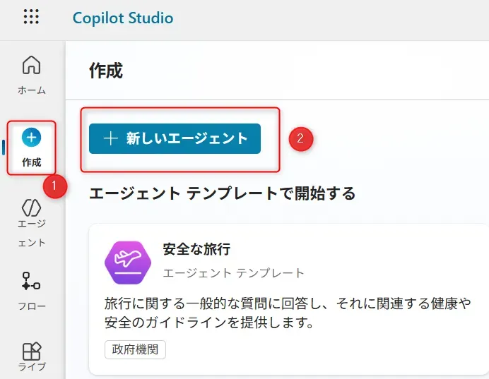 - ①画面左のナビメニューから「作成」をクリックし、②「新しいエージェント」をクリックします。