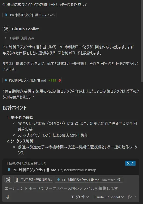 このように、仕様書と簡単なプロンプトから、必要な制御ロジックを判断しAIエージェントが作成までを担ってくれます。