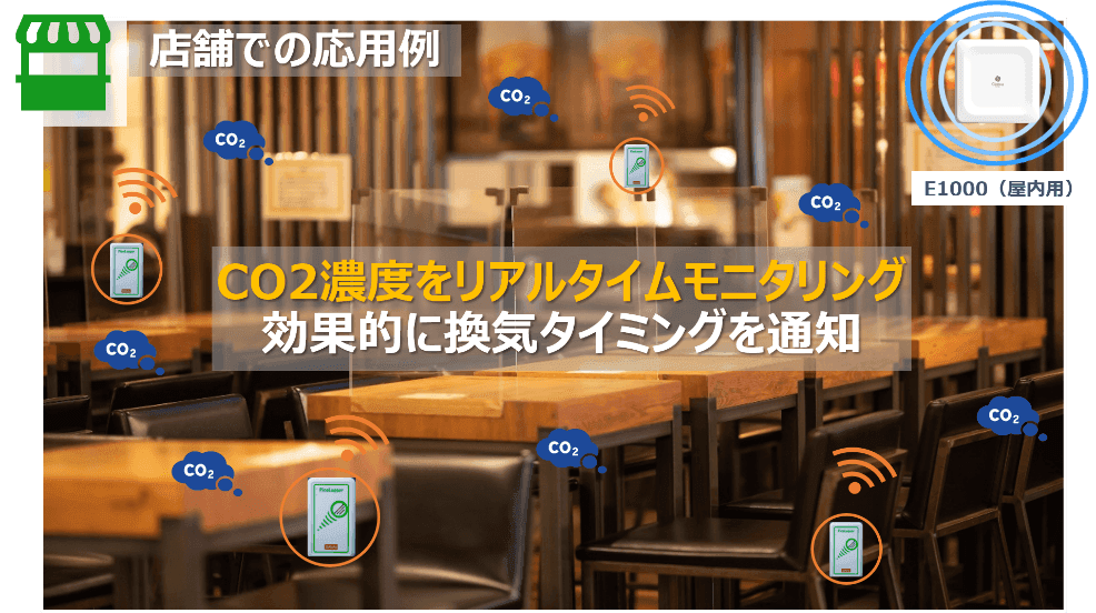 CO2センサーと屋内用BLEルーターの組み合わせで、店舗内の二酸化炭素濃度をリアルタイムでモニタリングし、効果的に換気タイミングを通知しています。