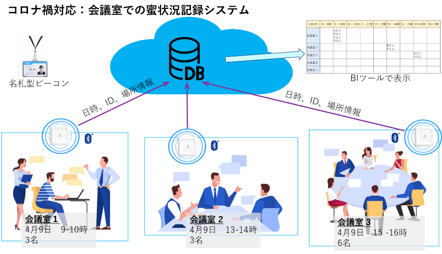 コロナ禍で働き方が大幅に変わり、テレワークや時差通勤以外にも、大なり小なり新型コロナ対策を進めている企業が多いのではないでしょうか。ここでは、上述したBLEセンサーを含め、BLEを活用した新型コロナ対策の活用例を3つご紹介します。