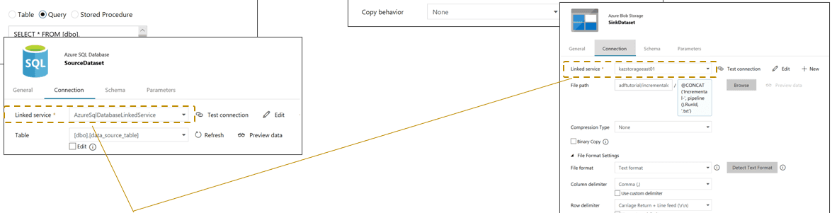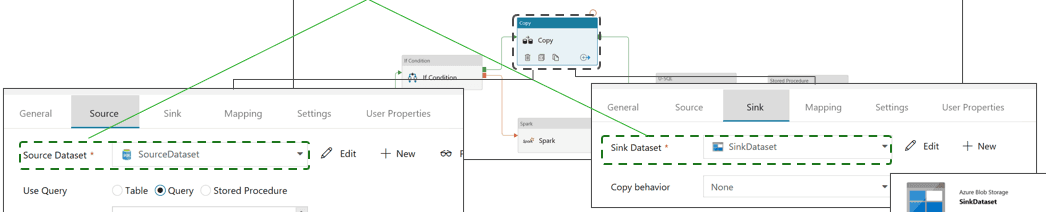 リンクサービスでは、ユーザーは外部サービスとの接続のために接続プロトコルを考えたりプログラムを作成することなく、簡単に外部サービスとリンクできます。例えば、BLOBコンテナーやフォルダはAzure BLOBデータセットで指定してリンク(接続)すると便利です。