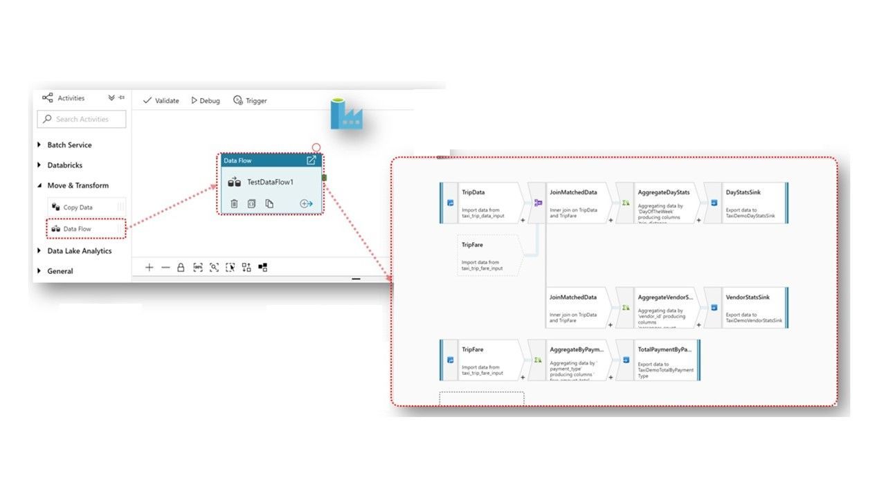 マッピングデータフローは、データの結合や集計処理などのETL処理をGUIで視覚的に設計できます。これにより、ノンプログラミングでデータ変換ロジックの開発が可能です。