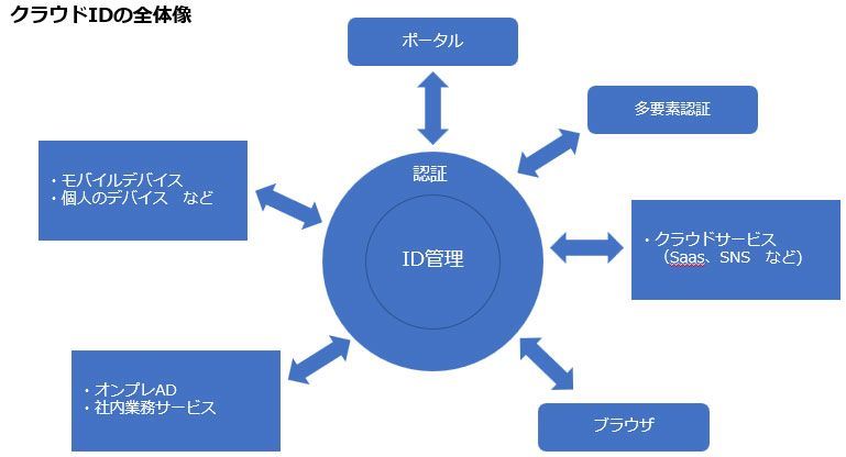 Azure ADとは、Microsoft Azureで提供されているクラウドサービスで、認証やアクセス認可、デバイス管理などIDの一元管理ができます。下図のように、クラウドIDを軸にした全体像を見るとイメージしやすいでしょう。