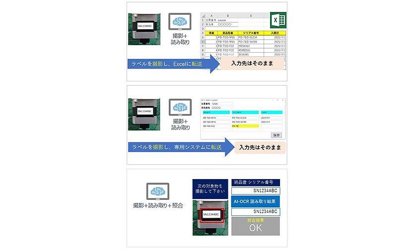 カメラやタブレットで撮影したラベルをAIが読み取り、ExcelやWebシステムに自動で入力してくれます。刻印文字や手書き文字の読み取りも可能です。撮影時に位置合わせは不要で、斜めの状態でも読み取れます。