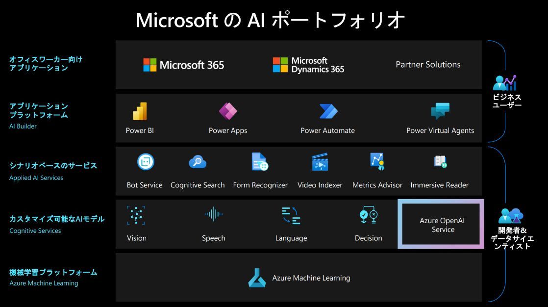 - Azure OpenAI:GPT-3、Codex、Embeddings モデルシリーズ、2023年3月よりChatGPT、GPT4など
