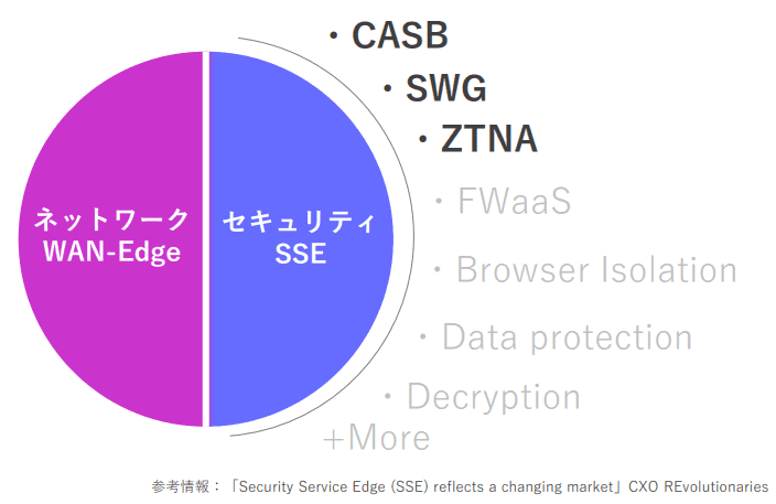 ゼロトラストの考え方を実現するための手段で、「CASB」「SWG」「ZTNA」の3つのコア機能から成り立つセキュリティサービスが「SSE」です。