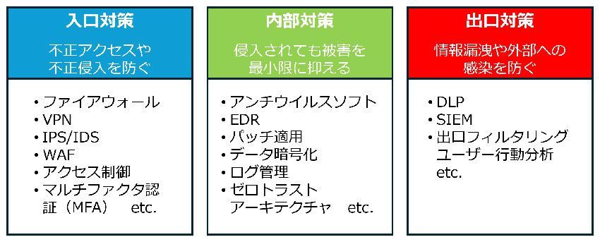- 入口対策:不正アクセスや不正侵入を防ぐ