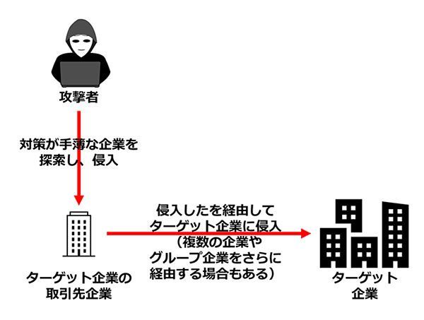 | サプライチェーン攻撃 | ソフトウェアやハードウェアのサプライチェーンの弱点を突いて、組織に侵入する攻撃 | |