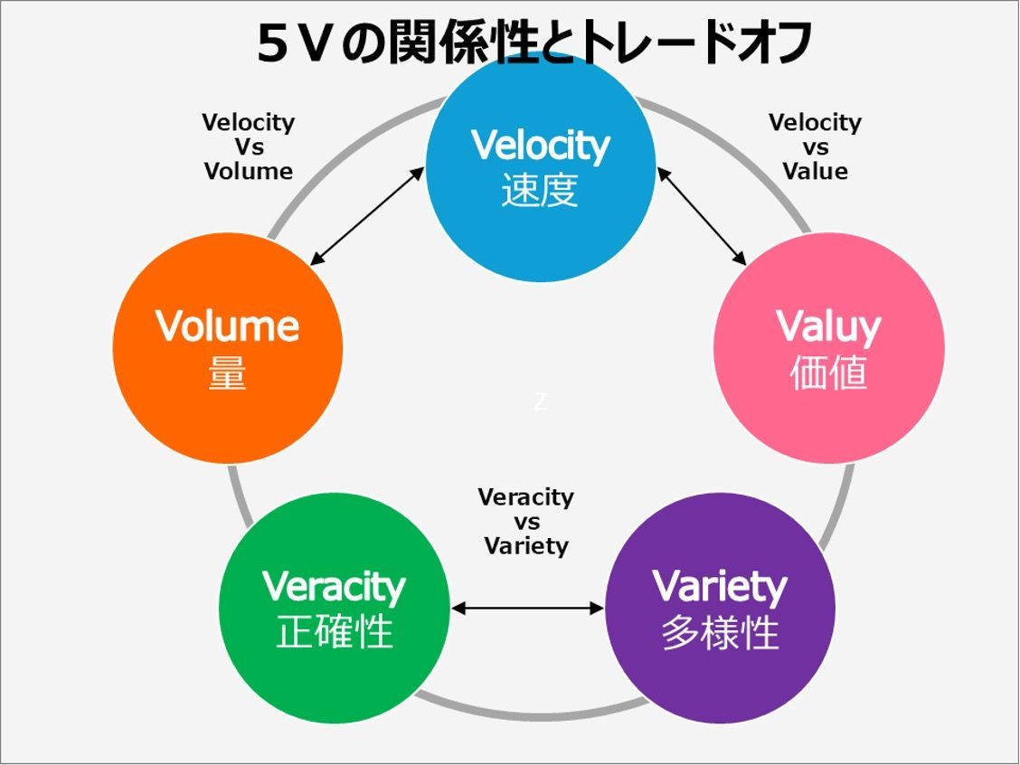 3V(Volume, Velocity, Variety)は元々のビッグデータの特徴を表す概念で、5Vはそれに Veracity(正確性)とValue(価値)を加えた拡張概念です。