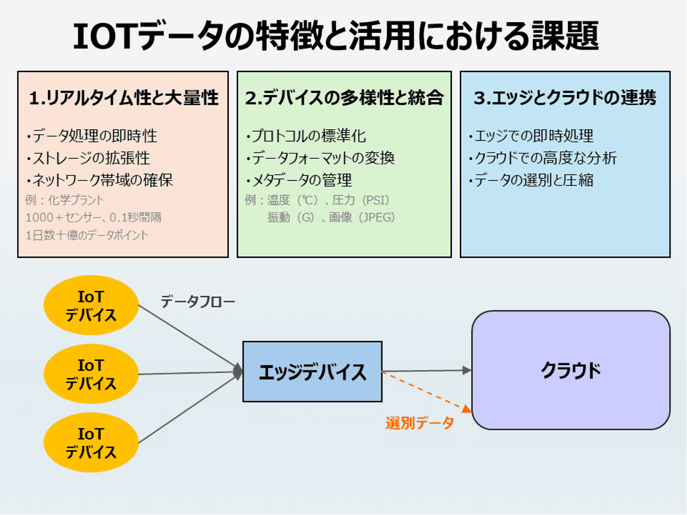 IoTデータの特徴と活用における課題を説明した図