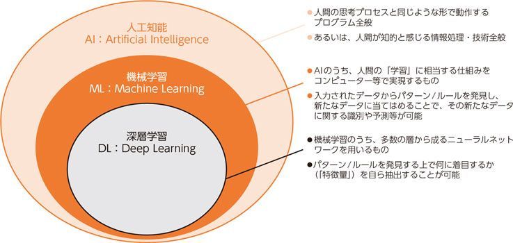 総務省では、AIと機械学習などの技術の関係性を以下のように表しています。